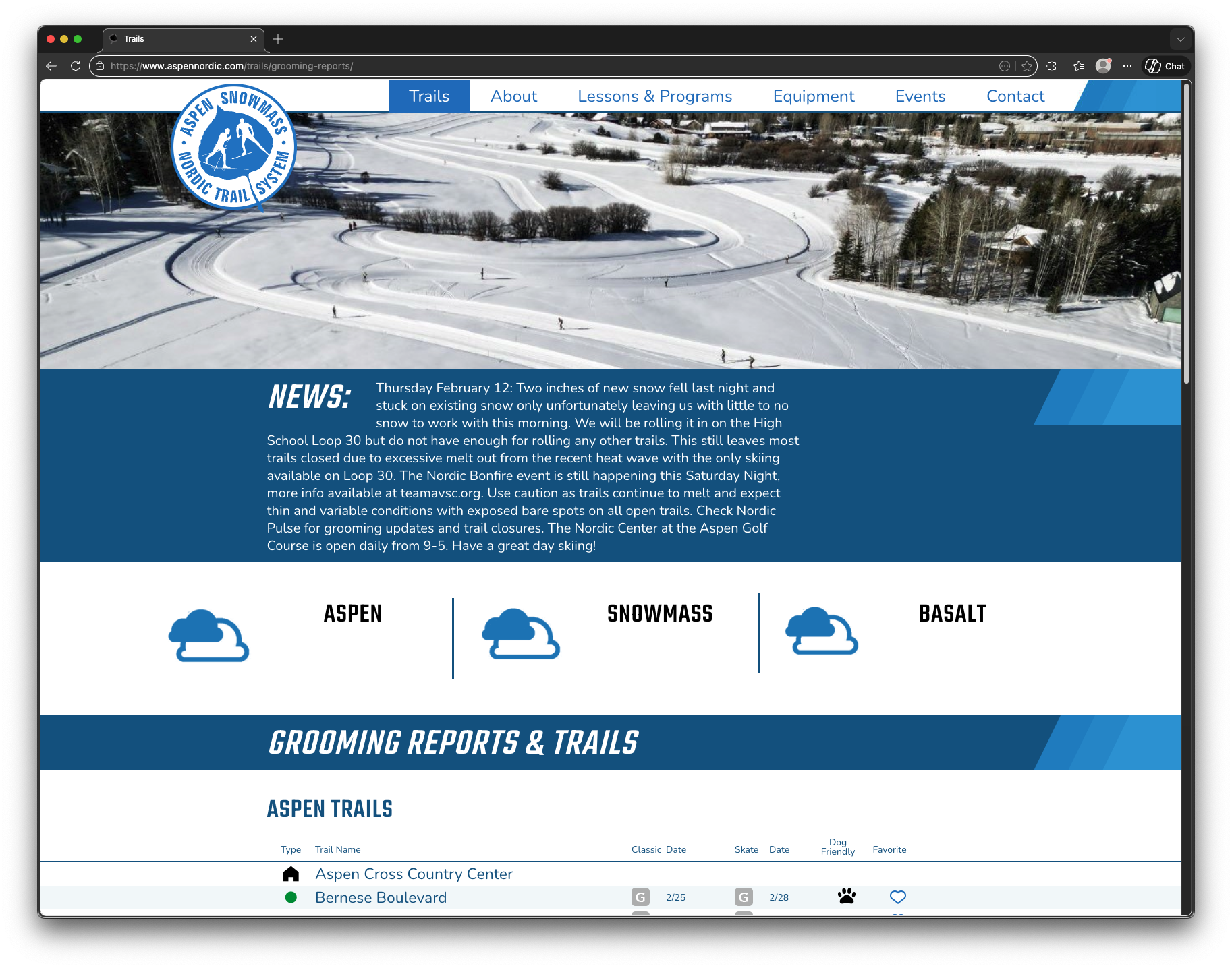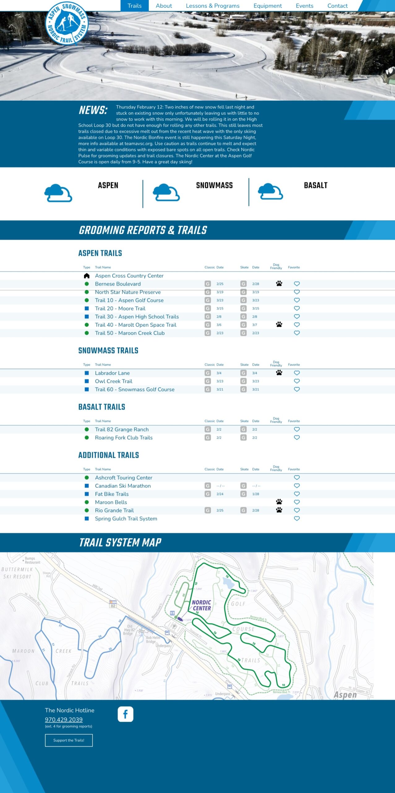 Real-time updates on trail grooming status, live events, and donations to the The Aspen/Snowmass Nordic Council 5013c non-prophet organization. Also provides information on private and group lessons as well as youth lessons. Information on ski rental equipment with prices.