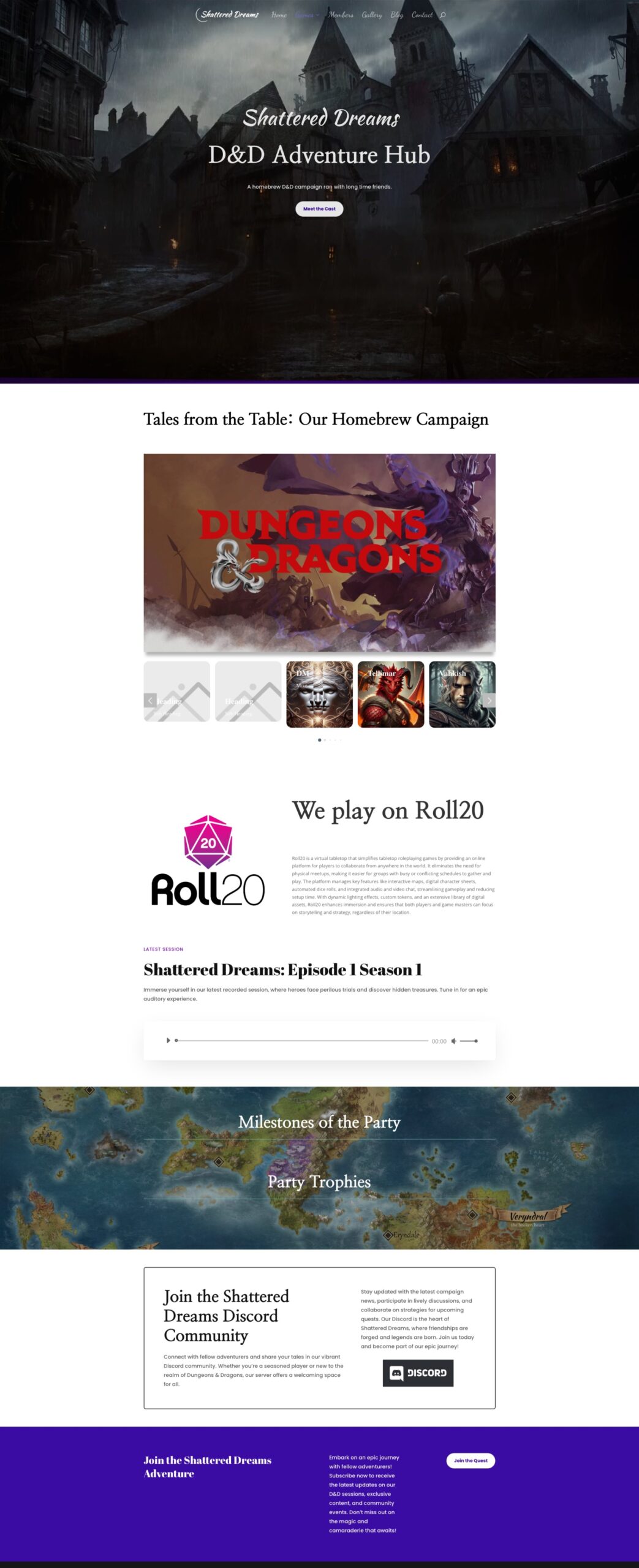 Shattered Dreams is more than a gaming community — it’s a world of its own. As lifelong gamers and storytellers, we wanted to create a site that captures the eerie magic of the fantasy worlds we grew up on. This project gave us room to flex: the hero section uses immersive visuals, atmospheric effects, and dramatic pacing to pull users in right from the first scroll.